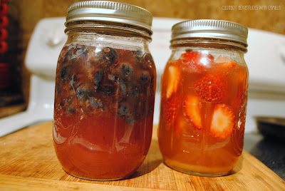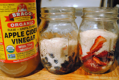This can be done with any fruit. And the more ripe, the better. This is a great way to preserve the fruit flavor even if the fruit itself is too far gone to really enjoy. Just don't use any fruit with mold, okay? As I think this is a great way to bottle up the taste of a season, I used some late summer strawberries from our CSA farm and some blueberries from the farmers' market.