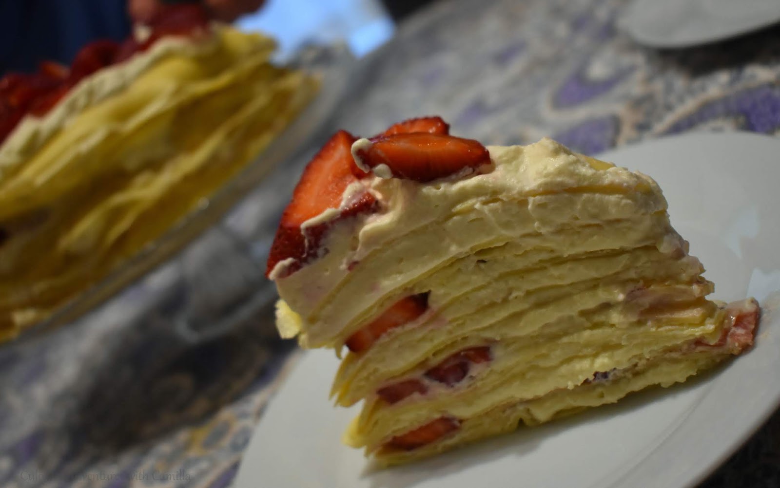 Layer in a crêpe, the cream, follolwed by another crêpe. Every third layer, scatter in sliced strawberries. Continue until you run out of crêpes or the cake is as tall as you would like. Cover the cake loosely and place it in the refrigerator to set.