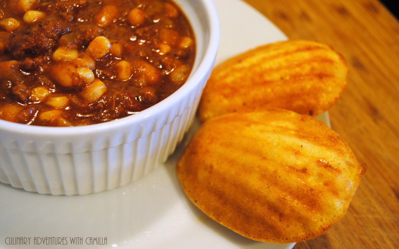 "Oh...and can you make chili to go with those?!?" Ummm...okay. If you haven't figured it out: I'm easily swayed and prone to culinary suggestion. I dug out my madeleine pan.*