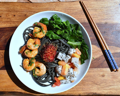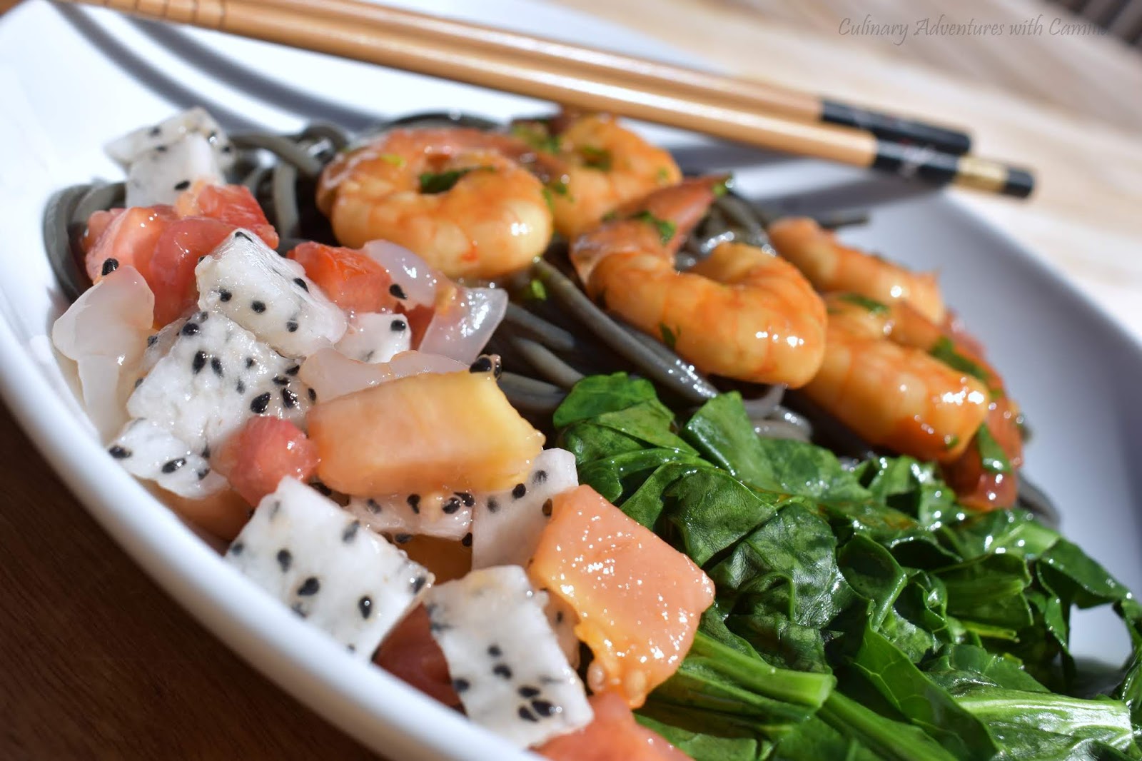 There were so many possibilities with all of these Freaky Fruits. But, as I usually do, I lean towards the savory and decided to make a simple noodle salad with spicy prawns, barely wilted greens, and a fresh, freaky fruits salsa. It was delicious.