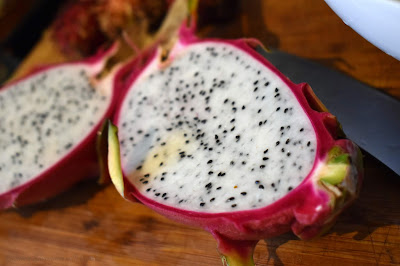 Dragonfruit grows on a vining cactus and has a vibrantly colored rind that houses a juicy flesh flecked with tiny, edible black seeds. The fruit is similar in texture to a cantaloupe or a kiwi; its flavor runs the gamut from sweet to tart to virtually non-existent. I prefer ones that are somewhere in between the first two. But, honestly, I haven't been able to figure out how to pick 'em. So, I usually just go for the color that I want on my plate.