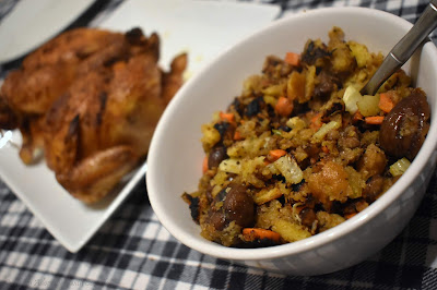 So, I decided to create Poussins aux Pain d'Epices, hens with gingerbread, and I made a stuffing with chestnuts, gingerbread spices, and gingerbread crumbles and seasoned the hens with traditional gingerbread spices. My boys quipped, "Is this a Thanksgiving dinner for hobbits?" Nope. Just eat it.