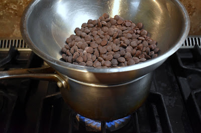 Place half of your chipped chocolate in a double-boiler and, over low heat, warm until melted. Remove from heat and stir in the other half of the chocolate. Set aside until the chocolate begins to lose its shine; it's beginning to crystallize. Then, return the chocolate to the double-boiler and warm, over very low heat, until smooth and glossy.