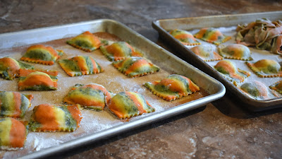 - three kinds of pasta dough (see this post), for this batch I used spinach dough, red pepper dough, and basic dough