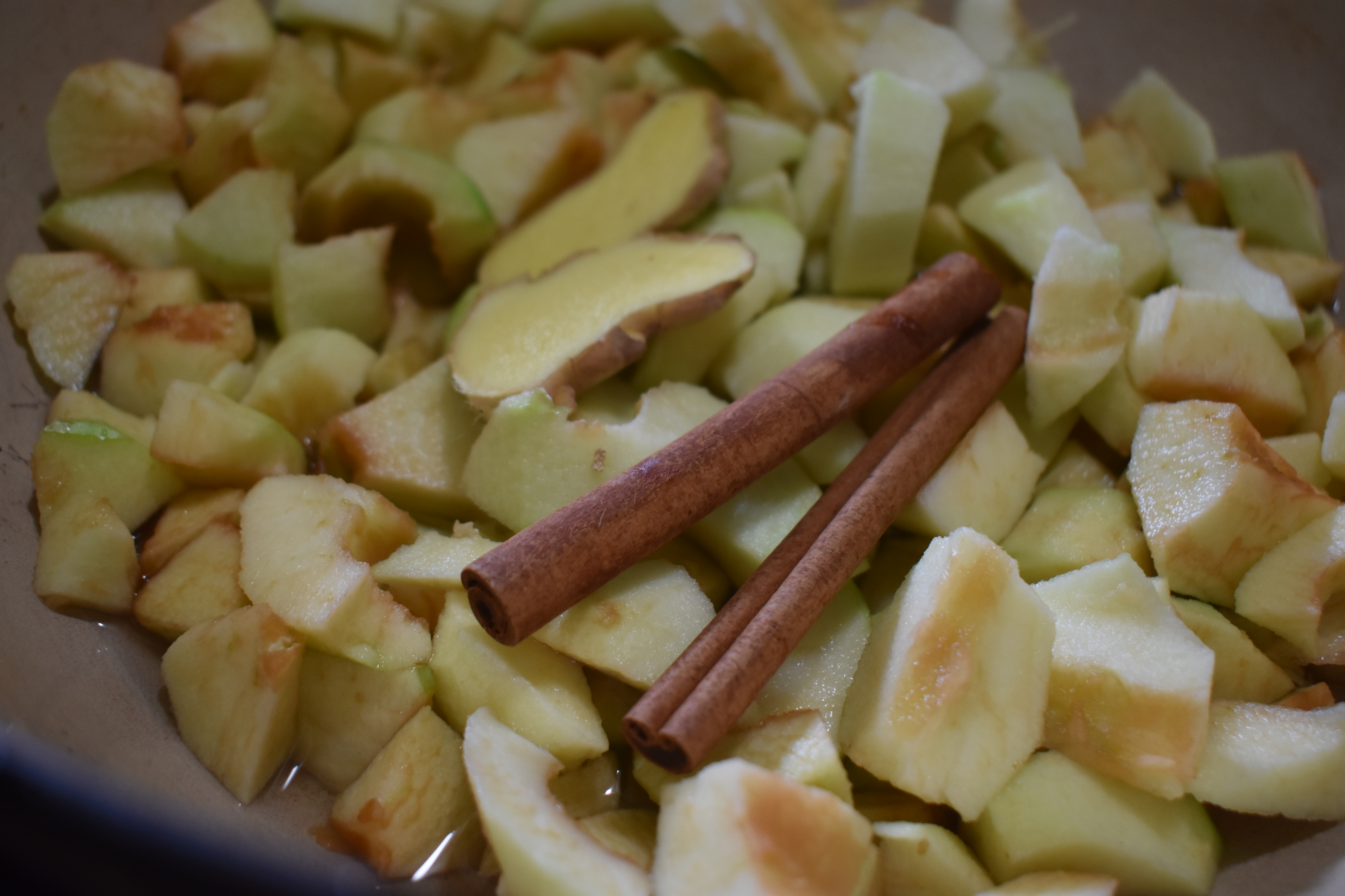 Tart apples with whole cinnamon sticks and a knob of fresh ginger! It's a delicious way to start a cake, right?